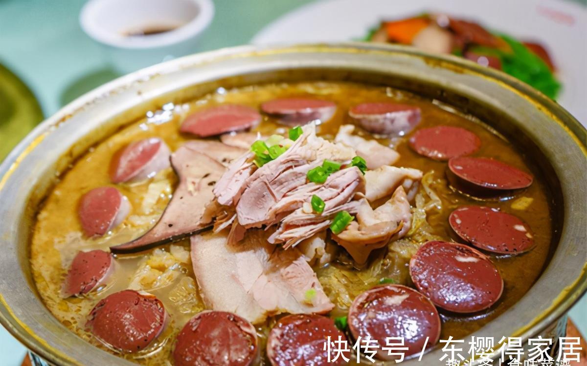 白肉是五花肉,血肠是牛羊血猪。肉和调味品,填入血肠,煮熟切片,酸菜白肉血肠,酸汤,酸菜酥脆,白肉肥而不腻,血肠鲜嫩可口,大锅炖温热,营养丰富。在里面。酸菜白肉又叫“杀猪菜”。这道菜越到年底越受欢迎。